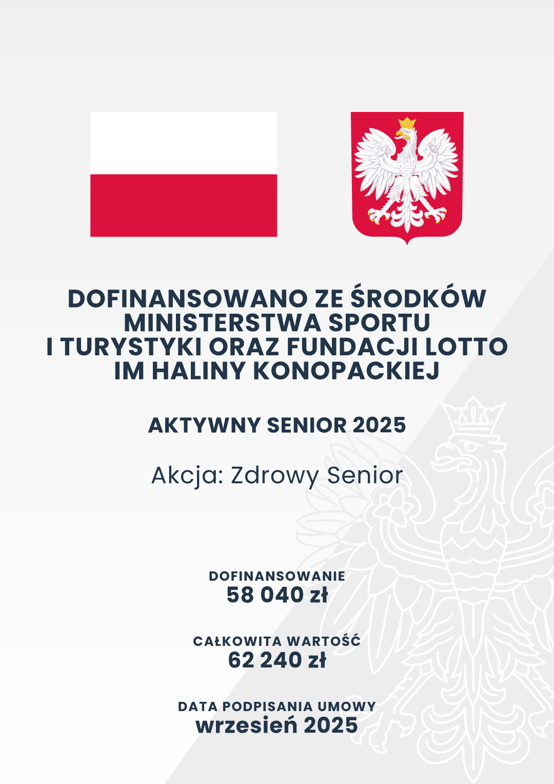 Projekt jest organizowany w ramach konkursu „Aktywny Senior 2025”, który finansowany jest ze środków Ministerstwa Sportu i Turystyki oraz Fundacji LOTTO im Haliny Konopackiej